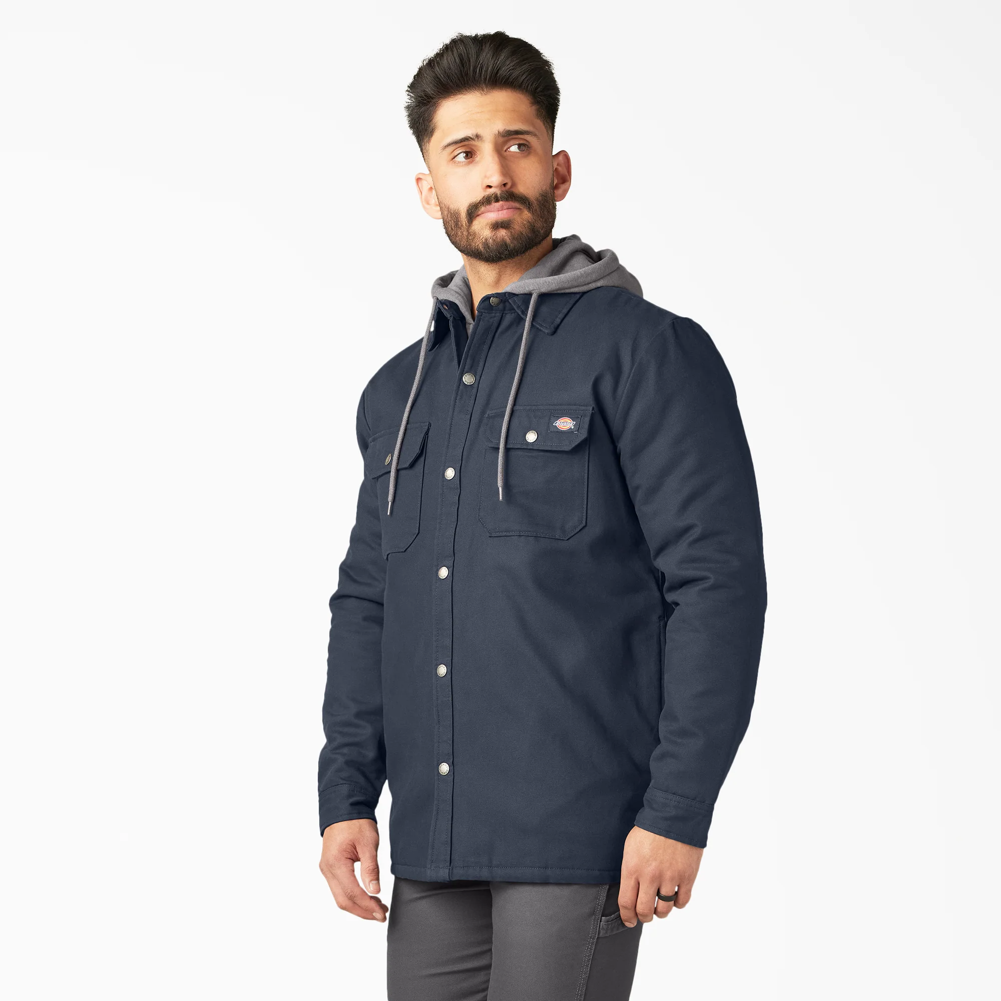 Keep going in any kind of weather with our Men's Water Repellent Duck Hooded Shirt Jacket. Its rugged canvas duck material is upgraded with a Durable Water Repellent (DWR) finish, while the lined jersey hood adds extra warmth so that you can focus on getting the job done. Store your work essentials in the chest pockets, and use the side pockets with fleece to warm your hands when the temperature drops. This Water Repellent Duck Hooded Shirt Jacket is a relaxed fit and versatile easy-on layer that you can count on.