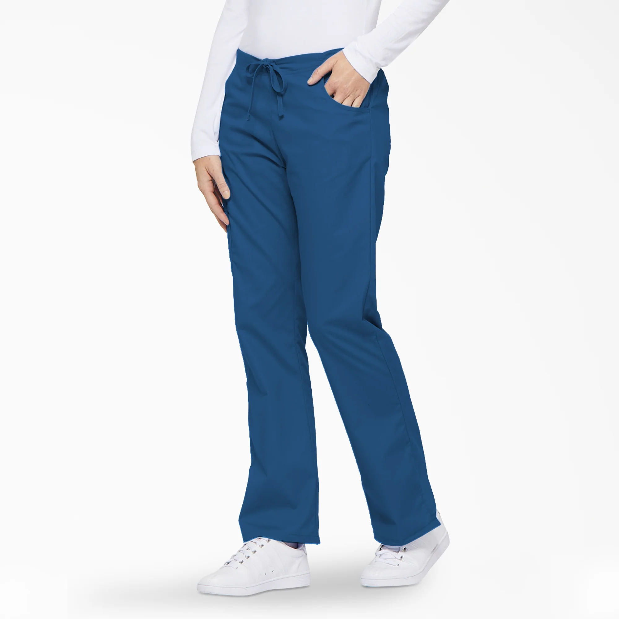 A Modern Classic fit, mid rise, moderate flare leg pant features an adjustable drawstring with elastic at the back waist and Dickies logo twill tape on the inside back waistband. Also featured are front scoop pockets, a back pocket, cargo pockets with a stretch Red knit interior pocket (White knit pocket on White) and side vents.