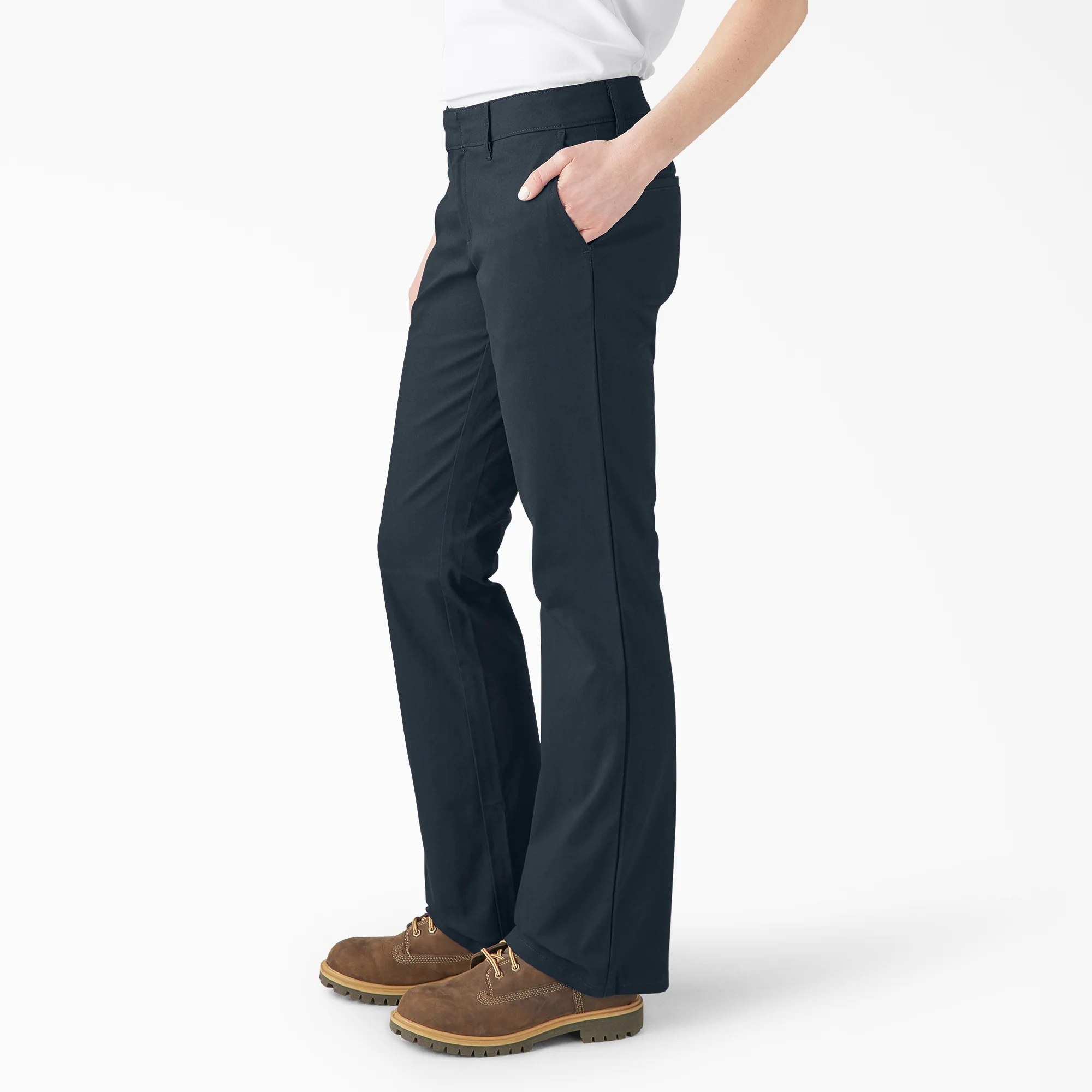 Dickies’ Women’s FLEX Slim Fit Bootcut Pants move along with you thanks to the breathable stretch twill fabric that feels extra soft and offers mobility all day long. These pants feature a contoured waistband with stretch for comfort and coverage, giving you the ability to bend, twist and move without ever worrying about comfort or gaping in the back. Store your gear in the front or back pockets, and feel at your best while you get the job done. Their flattering fit helps you look great at your jobsite.